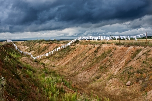 The installation is located in a once long and narrow agricultural field, andnow a trench caused by sand mining – an increasing phenomenon which deeply affectsthe landscape and economy of this rural area of Poland. The route of theclothesline reacts to this artificial topography, as it marks both banks of thesite while crossing it from one side to the other.
