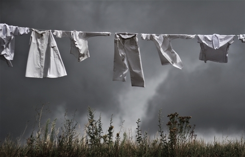 As visitors observe the installation,the hanging clothes imitate human figures walking in line. Blown by the windthey resemble prayer flags, commonly used in holy ceremonies. As visitorsfollow the linear path of the installation, they become part of the movement ofthe work, one of the pilgrims.